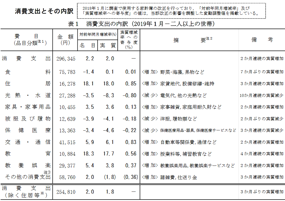 1月に消費支出が増加したのは、「食料」「住居」「家具・家事用品」「交通・通信」「教育」「教養娯楽」「その他の消費支出」7費目。