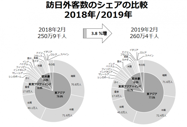 2019年2月の訪日外客数は前年同月比3.8%増の260万4000人。2018年2月の250万9000人を約9万人上回り、2月としては過去最多を記録した。