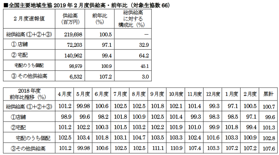 2月日生協統計|総供給高0.5%増/店舗2.9%減収・個配0.9%増収