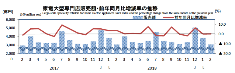 経済産業省発表の2月「商業動態統計速報」では、家電大型専門店販売額は3074億円で0.3%増だ。店舗数は1.1%増えて、2490店舗。