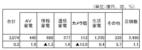 一方で、カメラ類は13.9%減と大きく低迷。情報家電も1.3減収だ。
