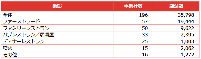 業態別に全店を調査している。3月の調査対象企業数は196社で前月から3社減った。また、店舗数も669店舗減少して3万5798店舗だ。その中でファストフードは1万9444店舗で全体の半数以上を占める。