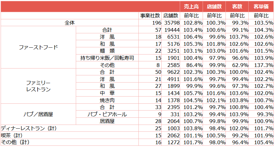 業態別伸び率では、ディナーレストラン3.8%、ファストフード3.4%、パブ・ビアホール3.2%、ファミリーレストラン2.3%、喫茶1.1%、居酒屋0.7%。全業態が前年を上回った。