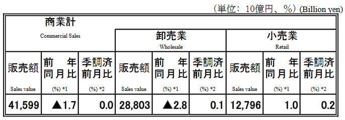 卸売業と小売業を合わせた商業販売額は41兆5990億円で、前年を1.7%下回った。季節調整済みでは横ばい。