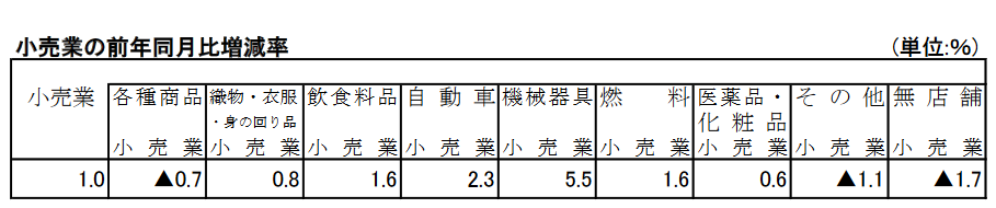 小売業の販売額は12兆7960億円で1.0%増。季節調整済みでは0.2%増だ。機械器具小売業5.5%増をはじめ6業種が増収だ。一方、各種商品小売業、無店舗小売業は前年割れだ。