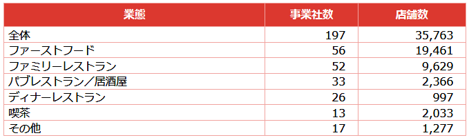 業態別に全店を調査している。4月の調査対象企業数は197社で前月から1社増えた。しかし、店舗数は35店舗減少して3万5763店舗だ。その中でファストフードは1万9461店舗で全体の54%を占める。