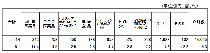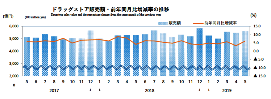 経済産業省発表「商業動態統計速報」では5月のドラッグストア販売額は5614億円、前年同月比6.1%増。店舗数は5.3%増加して1万6035店になった。積極出店が続いているため全体としては増収傾向にある。