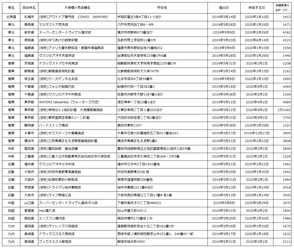 経済産業省から5月の「大規模小売店舗立地法にともなう新設届出申請」が発表された。申請件数は30件。