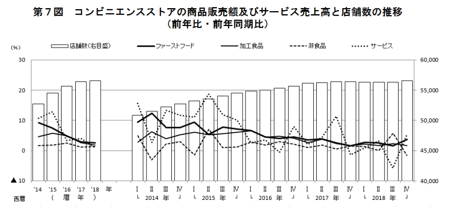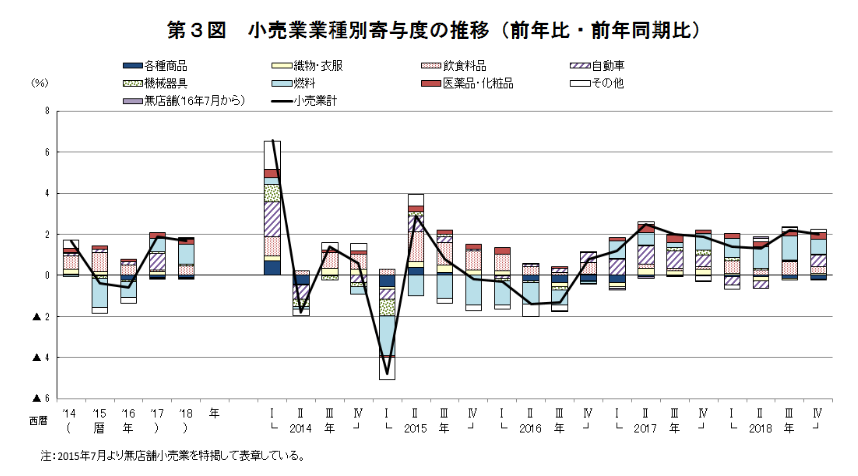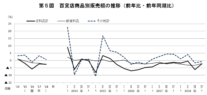 百貨店は1.7%減と3年連続して減収となった。既存店ベースでも2年ぶりに0.3%減少した。 化粧品や高額商品がインバウンド需要、国内需要に支えられて好調だったが、閉店による影響と、天候不順による主力の衣料品が低迷した。