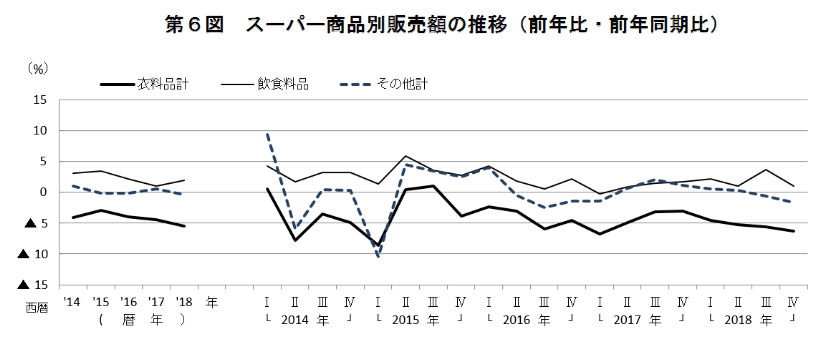スーパーマーケット(食品スーパー+総合スーパー)は0.9%増。出店効果と、惣菜や主力の飲食料品が堅調に推移したことで増収。しかし既存店ベースでは▲0.5%で2年連続の減少だった。総合スーパーは専門店・通販との競合により、衣料品、家具、家庭用品は不振。