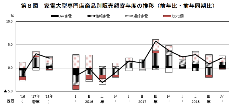 家電大型専門店は2.1%増。スマートフォン需要で通信家電は7.5%増。AV家電はテレビが堅調で3.7%増と、いずれも2年連続で前年を上回った。生活家電は、エアコン、洗濯機、冷蔵庫などが売上げを伸ばし、2.9%と3年連続の上昇。 一方、カメラ類▲5.0%と、情報家電▲1.2%は、いずれも2年ぶりの減少だ。