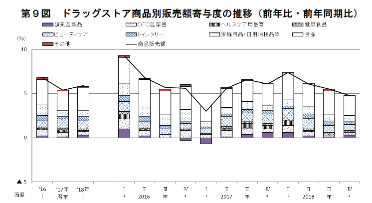 ドラッグストアは5.9%増。店舗数が前年より611店舗増えたことが寄与した。 食品は9.5%増、ビューティケアは6.6%増。健康食品も、サプリメントが売上げを伸ばし6.6%増となり、すべての商品分野で前年を上回った。