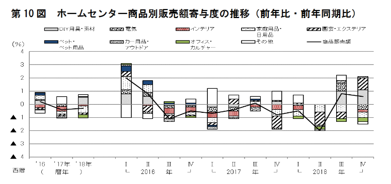 ホームセンターは▲0.3%。 オフィス・カルチャー▲4.5%、家庭用品・日用品▲2.4%と、いずれも2年連続の減少だ。一方、DIY用具・素材は、台風や地震などの特需で建材、補修材に動きが見られ、2.5%増と2年ぶりに前年を上回った。