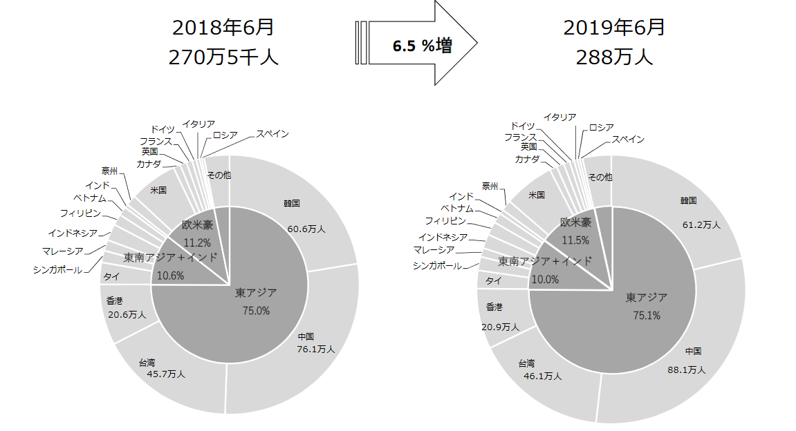 日本政府観光局(JNTO)によれば、2019年6月の訪日外客数は、前年同月比6.5%増の288万人となり、前年6月の270万5000人を17万人上回り、6月として過去最多となった。