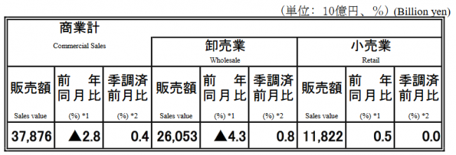 卸売業と小売業を合わせた商業販売額は37兆8760億円で、前年同月を2.8%下回った。
