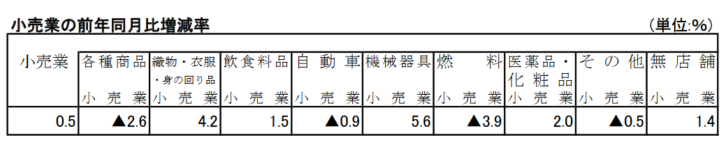 小売業の販売額は11兆8220億円で0.5%増。織物・衣服・身の回り品小売業4.2%増、医薬品・化粧品小売業2.0%増など4業態が牽引した。
