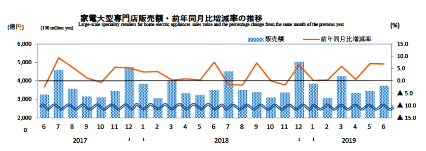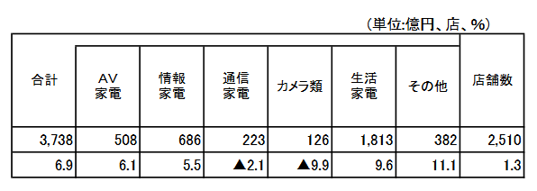 経済産業省発表の6月「商業動態統計速報」では、家電大型専門店の販売額は3738億円、前年同月比6.9%増と、大きく伸長した。店舗数は1.3%増の2510店舗。