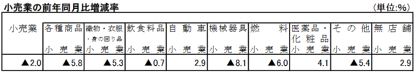 小売業の販売額は12兆1650億円で2.0%マイナスだった。自動車の2.9%増と医薬品、化粧品の4.1%増の2業態以外はすべて減少している。
