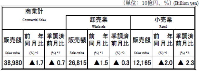 その7月の商業販売額は38兆9800億円で全年同月を1.7%下回った。商業販売額は小売業と卸売業のすべての販売額である。