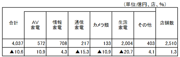 カテゴリー別に見ると、生活家電が20.7%減、通信家電が15.3%減、カメラ類が10.9%減となった。一方、AV家電が0.9%増、情報家電が4.3%増、その他が4.1%増となった。