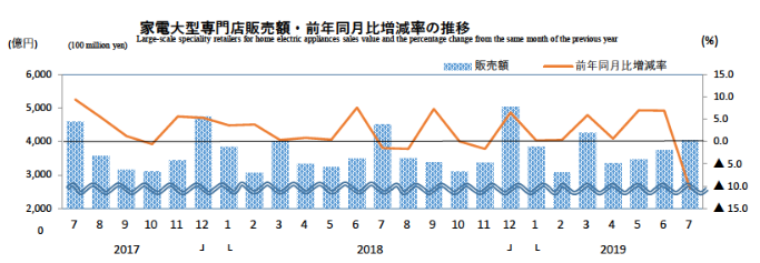 経済産業省発表「商業動態統計速報」によれば、7月の家電大型専門店の販売額は4037億円となり、前年同月比10.6%減と前年を大幅に下回った。店舗数は前年比1.3%減の2510店で6月と変わらない。