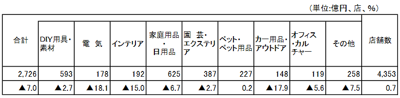 カテゴリ-別に見ると、電気が18.1%、カー用品・アウトドアが17.9%、インテリアが15.0%、家庭用品・日用品が6.7%、オフィス・カルチャーが5.6%、DIY用具・素材が2.7%、園芸・エクステリアが2.7%、その他が7.5%と、すべて減少した。一方、ペット・ペット用品だけが0.2%の増加となった。