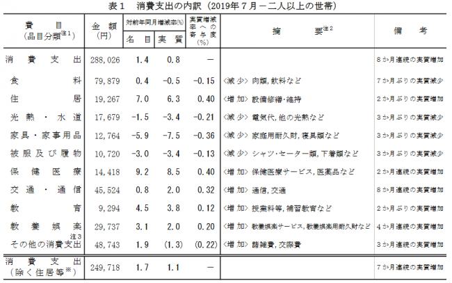 7月の「家計調査報告」速報が、総務省統計局から発表された。