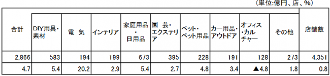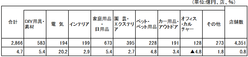 カテゴリ-別に見ると、電気が20.2%、家庭用品・日用品とDIY用具・素材がともに5.4%、ペット・ペット用品が4.8%、カー用品・アウトドアが3.4%、インテリア2.9%、園芸・エクステリアが2.7%、その他が1.8%と、増加した。一方、オフィス・カルチャーだけが4.8%の減少となった。