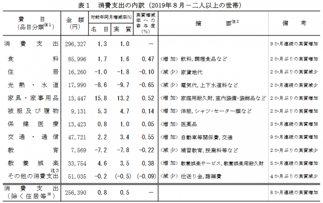 8月の「家計調査報告」速報が、総務省統計局から発表された。