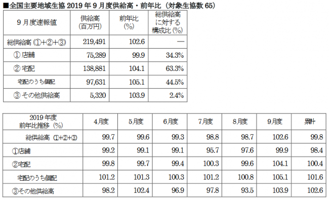 流通スーパーニュース > 統計 > 9月日生協統計|総供給高2.6%増/店舗0.1%微減・個配5.1%増 9月日生協統計|総供給高2.6%増/店舗0.1%微減・個配5.1%増 統計 / 2019年10月23日 ツイート 日本生活協同組合連合会(東京都渋谷区、本田英一代表理事会長)の9月の総供給高(売上高)は2194億9100万円で、2.6%増と前年同月を上回った。 店舗販売は752億8900万円の前年比0.1%減だ。農産が不調の一方で、軽減税率対象外の酒、住居関連品が好調だった。 一方、宅配は4.1%増、うち個配は5.1%増と大きく伸長。衣料品、住居関連品、酒が好調であった。 主要地域生協の9月度供給実績(速報値) ツイート