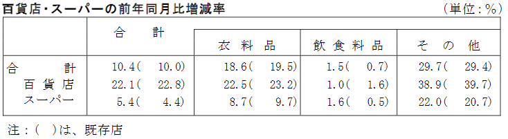 では業態別に詳細を見ていく。百貨店・スーパー販売額は1兆6717億円、前年同月比10.4%の増加となった。百貨店は5615億円、22.1%の増加(既存店は22.8%増)、スーパーは1兆1102億円、5.4%の増加(既存店は4.4%増)となった。衣料品は18.6%の増加、飲食料品は1.5%の増加、その他は29.7%の増加だ。