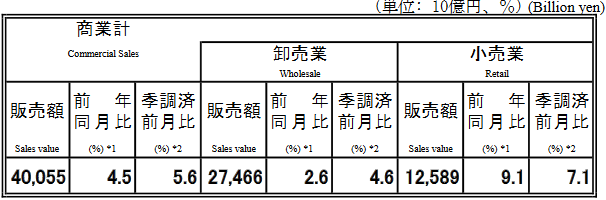 昭和28年(1953年)から始められた商業動態統計は国の機関統計である。小売業・卸売業を営む企業と事業所・店舗の事業活動に関する動向の把握を目的とするもので、毎月調査・発表される。その9月の商業販売額は40兆0550億円で全年同月を4.5%上回った。商業販売額は小売業と卸売業のすべての販売額である。