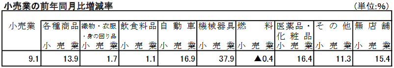 小売業の販売額は12兆5890億円で9.1%プラスだった。燃料の0.4%減以外はすべて増加している。