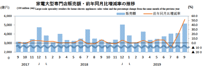 経済産業省発表「商業動態統計速報」によれば、9月の家電大型専門店の販売額は5154億円となり、前年同月比52.4%増と前年を大幅に上回った。店舗数は前年比1.2.%増の2514店。
