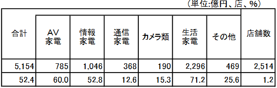 カテゴリー別に見ると、生活家電が71.2%の増加、AV家電が60.0%の増加、情報家電が52.8%の増加、その他が25.6%の増加、カメラ類が15.3%の増加、通信家電が12.6%の増加となった。