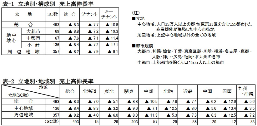 「立地別・地域別」でも、すべての地域で前年を5%以上下回り、全国的にマイナスとなった。