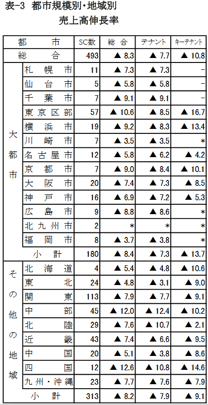 「都市規模別・地域別」の総合は大都市が8.3%減。大都市では東京区部が▲10.6%、四国が▲12.6%と2ケタを超える大幅減となり、13都市すべてが前年を下回った。