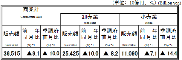 昭和28年(1953年)から始められた商業動態統計は国の機関統計である。小売業・卸売業を営む企業と事業所・店舗の事業活動に関する動向の把握を目的とするもので、毎月調査・発表される。その10月の商業販売額は36兆5150億円で全年同月を9.1%下回った。商業販売額は小売業と卸売業のすべての販売額である。