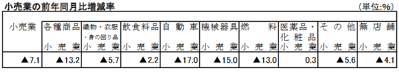 小売業の販売額は11兆0900億円で7.1%マイナスだった。医薬品・化粧品の0.3%増以外はすべて減少している。
