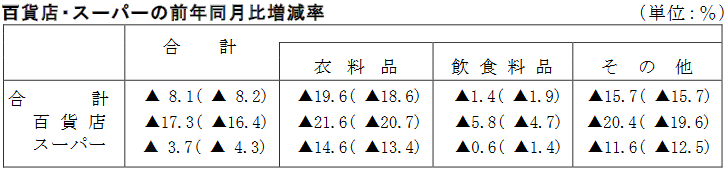 百貨店・スーパー販売額は1兆4577億円、前年同月比8.1%のマイナス。百貨店は4265億円、17.36%減(既存店は16.4%減)、総合スーパーは1兆0312億円、3.7%のマイナス(既存店は4.3%減)となった。衣料品は19.6%の減少、飲食料品は1.4%の減少だ。