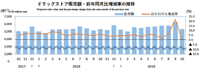 10月ドラッグストア統計|販売額5325億円/調剤医薬品8.9%・食品7.4%増