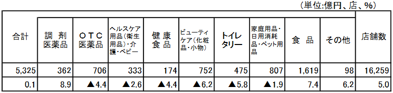 カテゴリー別に見ると、ビューティケア(化粧品・小物)が6.2%減、トイレタリーが5.8%減、OTC医薬品が4.4%減、健康食品が4.4%減、ヘルスケア用品(衛生用品)・介護・ベビーが2.6%減、家庭用品・日用消耗品・ペット用品が1.9%の減少となった。一方、調剤医薬品は8.9%増、食品7.4%増、その他が6.2%増だった。