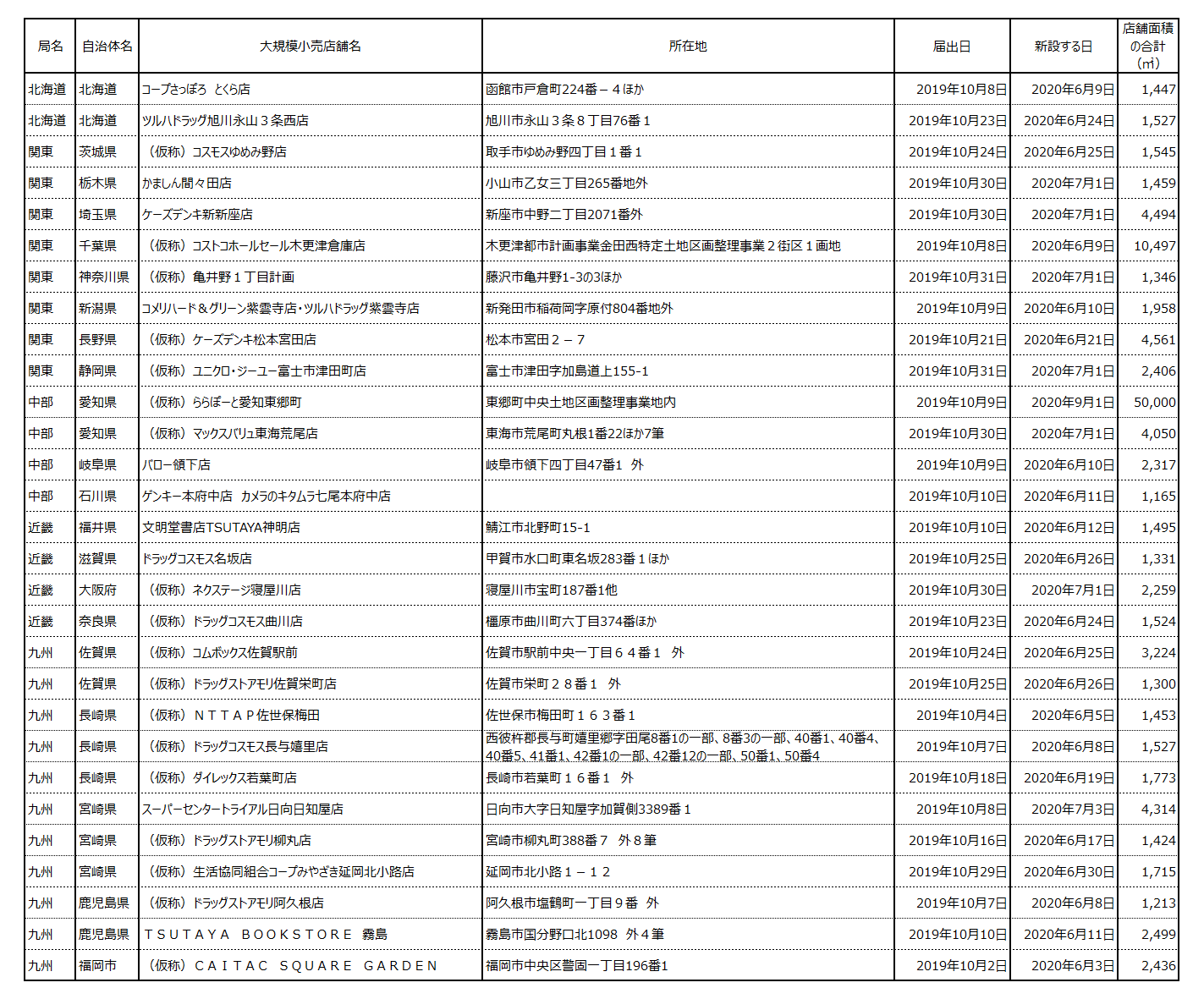 経済産業省から10月の「大規模小売店舗立地法にともなう新設届出申請」が発表された。申請件数は29件。