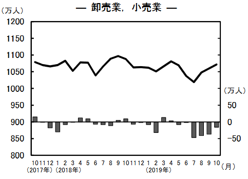 10月労働力調査統計|雇用者6787万人82カ月伸長も商業従事者は16万人減少