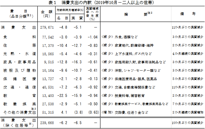 2人以上の世帯の消費支出は27万9671円。前年同月比では実質5.1%減と、駆け込み需要の反動減で大きく消費支出が減少し、11カ月ぶりに前年を下回った。また台風19号の影響も大きかった。