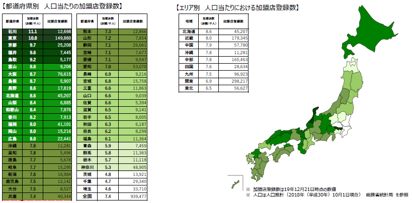 12月21日時点で、人口1人当たりの加盟店数が多かったのは、都道府県別で見ると石川、東京、京都、福井、鳥取の順で、エリア別で見ると北海道、近畿、中国の順だった。