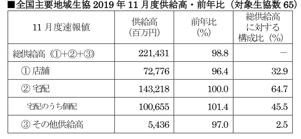 11月日生協統計|総供給高2214億円1.2%減/個配は前年並みに復調