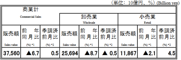 昭和28年(1953年)から始められた商業動態統計は国の基幹統計である。小売業・卸売業を営む企業と事業所・店舗の事業活動に関する動向の把握を目的とするもので、毎月調査・発表される。その11月の商業販売額は37兆5600億円で全年同月を6.7%下回った。商業販売額は小売業と卸売業のすべての販売額である。