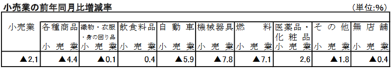 小売業の販売額は11兆8670億円で2.1%のマイナスだった。医薬品・化粧品の2.6%増と飲食料品の0.4%増以外はすべて減少している。
