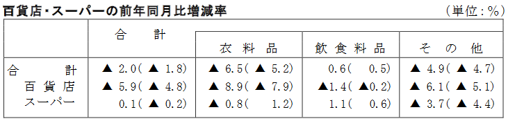 百貨店・スーパー販売額は1兆6108億円、前年同月比2.0%のマイナス。百貨店は5448億円、5.9%減(既存店は4.8%減)、総合スーパーは1兆0660億円、0.1%のプラス(既存店は0.2%減)となった。衣料品は6.5%の減少、飲食料品は0.6%の増加だ。